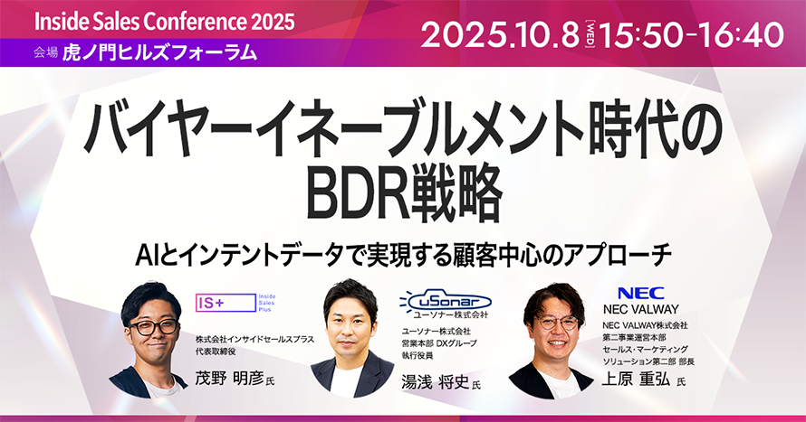 本セッションでは、NEC VALWAY株式会社とユーソナー株式会社による実践事例を通じて、AIとインテントデータを活用しながらバイヤーイネーブルメントを実現するBDR戦略を学びます。