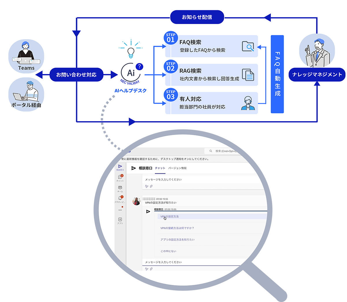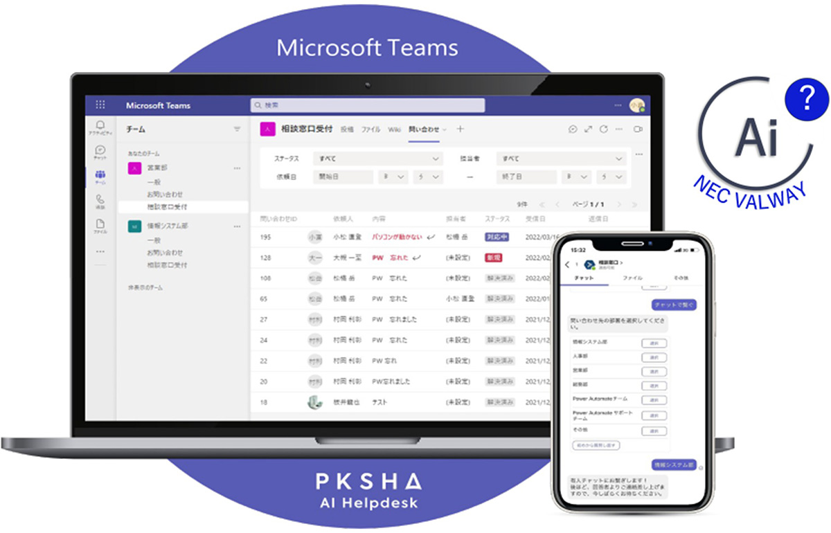 NEC コミュニケーションDX支援サービスでは、Microsoft Teams上に社内ヘルプデスク環境を構築します。