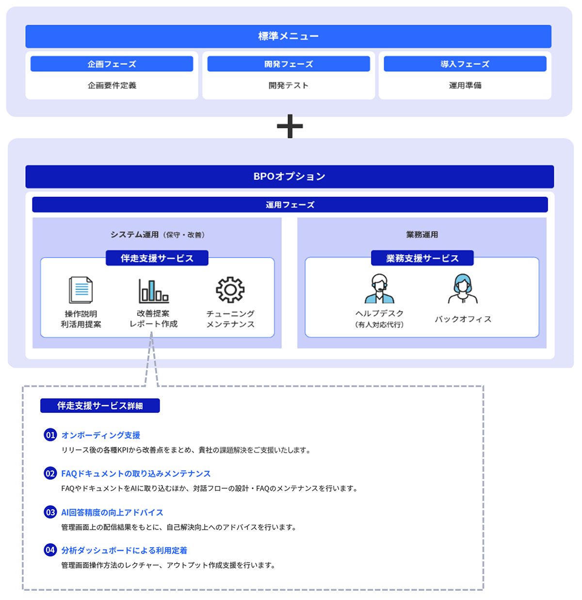 AIヘルプデスクの環境構築に加え、導入前後をフォローする「伴走支援サービス」をつけることで、スムーズに導入できます。